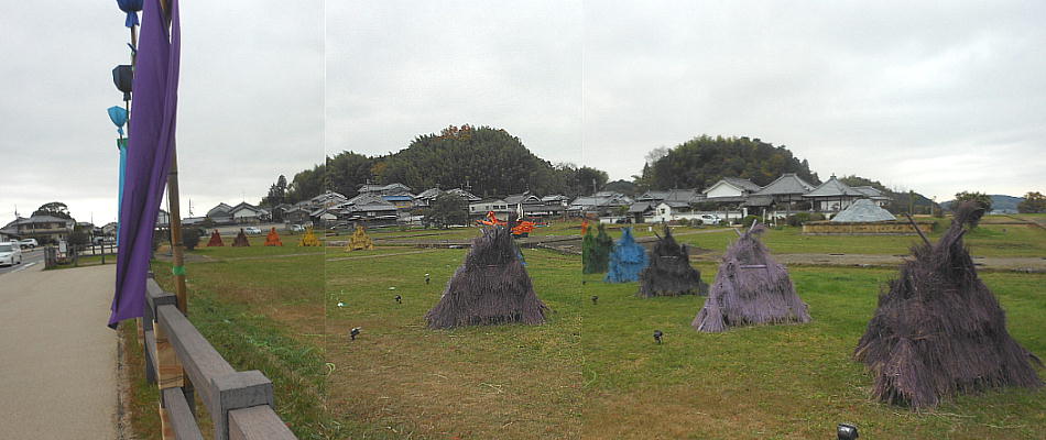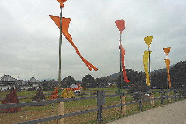 川原寺前の広場になにやら造形物があって幟もたっていた。