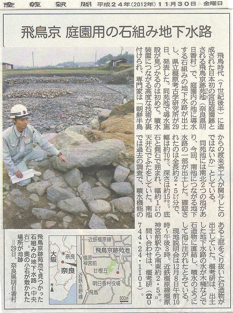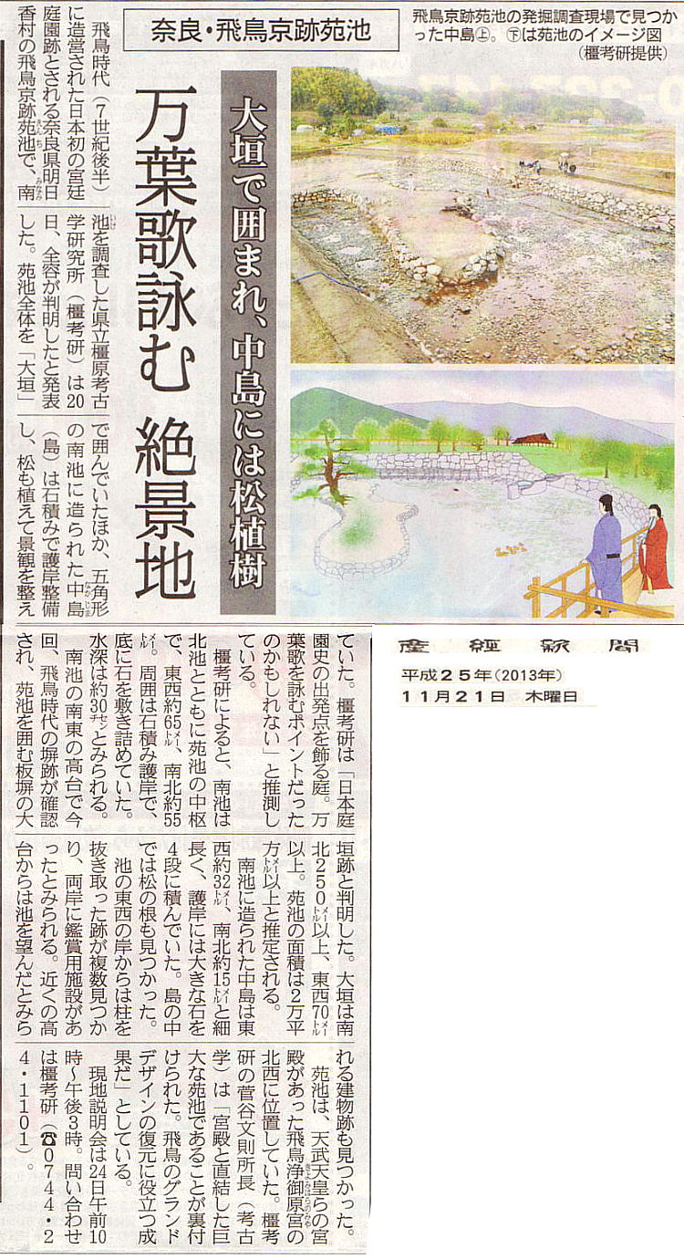 今年も飛鳥京跡の、苑池遺構発掘調査の記事が新聞に載った。前回が昨年の12月3日なので、丁度一年ぶりである。私は以下のように、