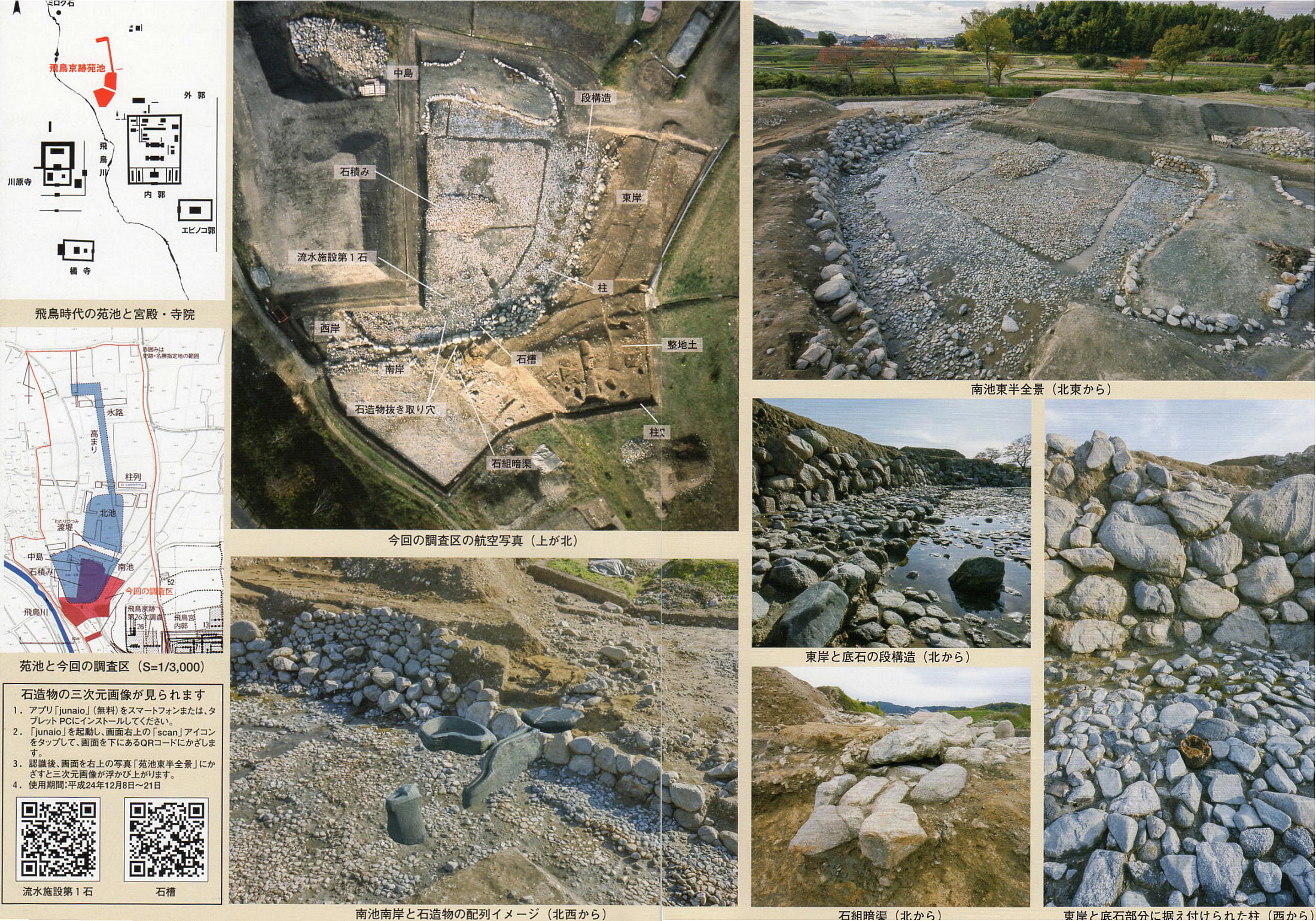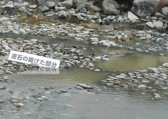 一、「底石の抜けた部分」という表示の所は、そこだけ石が敷いてなく、柱を抜き取ったような坑になっていて、南池の周辺を巡っ
