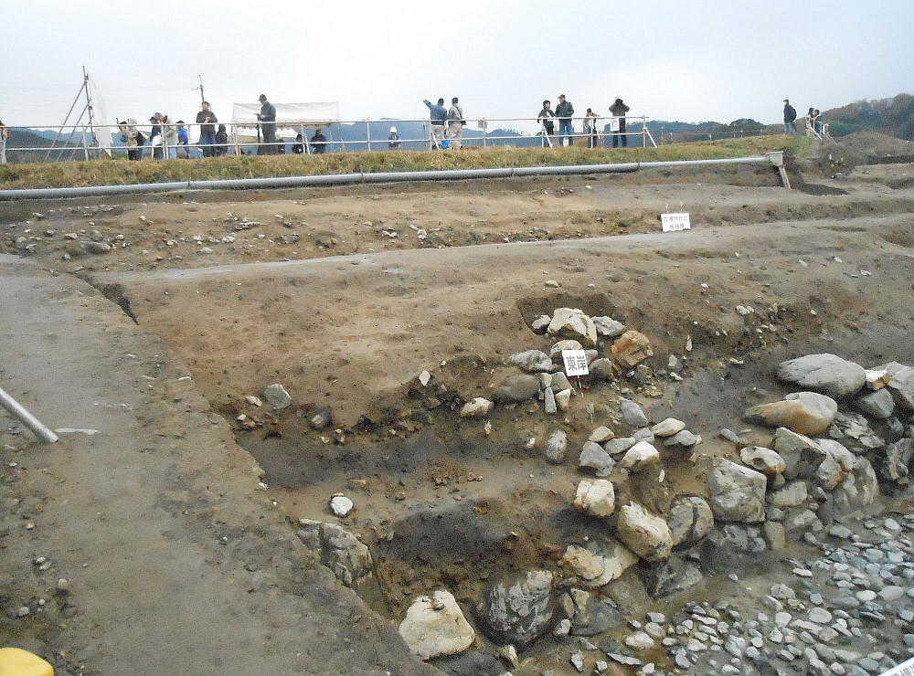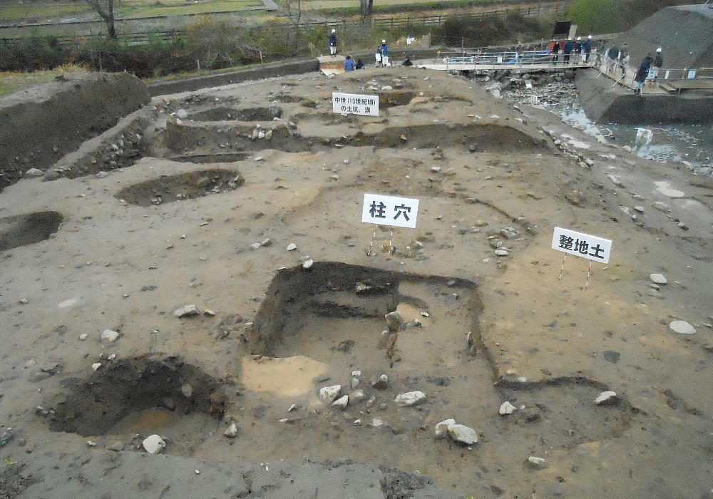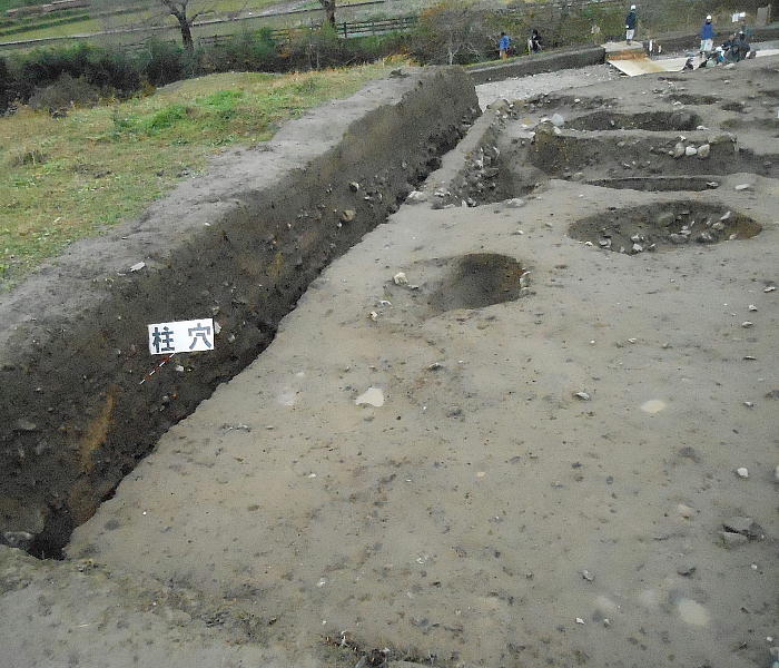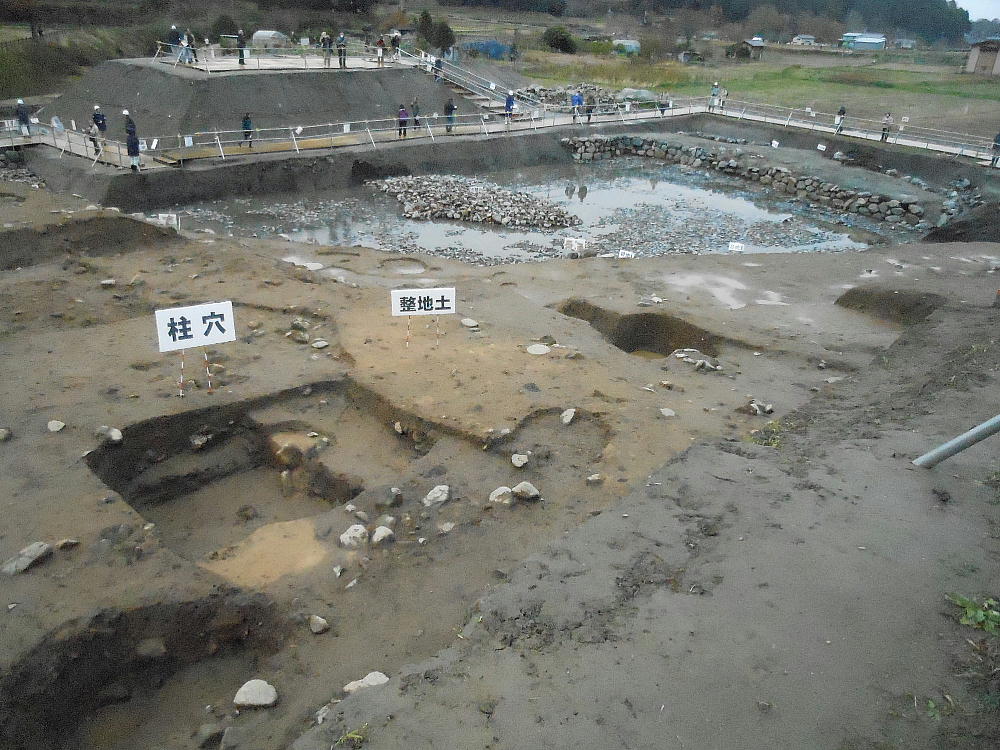 今回新たに出現した飛鳥時代の柱跡と整地した跡。その向こうには中世(13世紀)の土坑、溝跡もあった。
