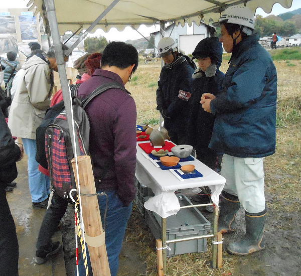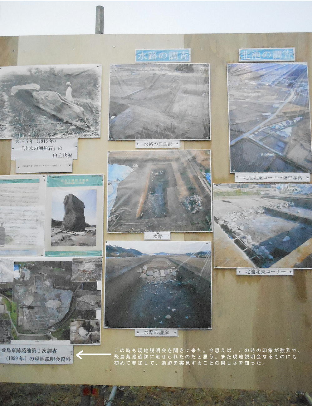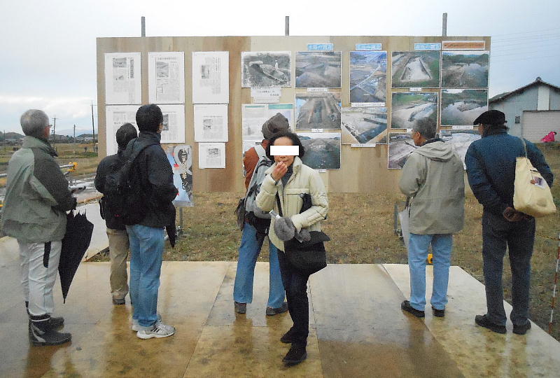 説明会場の入り口で、今回の(或いは今までの)出土品や過去の発掘調査の報告パネルを見る。
