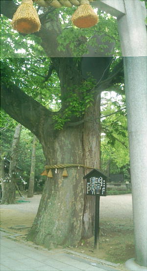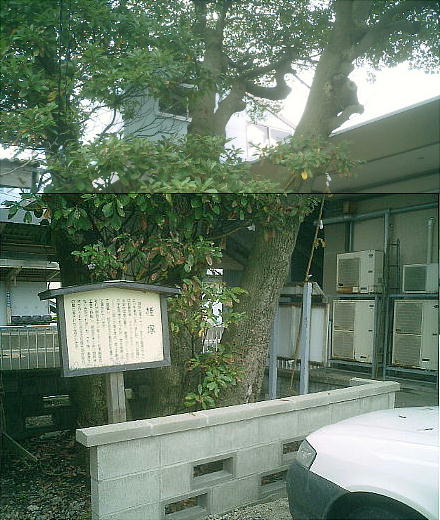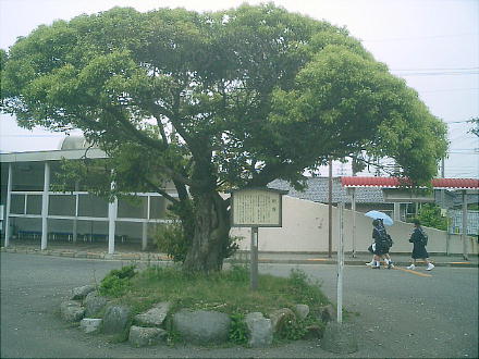 同じく羽咋駅前の、姫塚とは反対側の駅前広場の一角に、これまた1本の木が立っていて、ここが「剣塚」である。これ