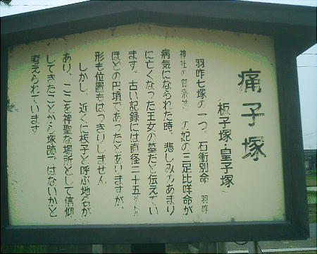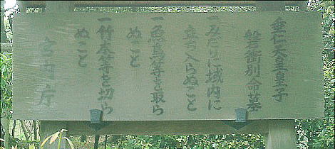 「旧記」に「三足比唐フ女王、三足比燈aム時、哀痛シテ甍ズ」「板子墓東西十二間南北十四間皇子墓」とみえる。現在