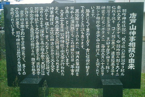 駅前には「唐戸山神事相撲の由来」碑がたっている。この地の相撲好きは、磐衝別命が相撲が好きだったという事に由来し
