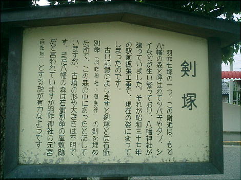 「社記」に「八幡社、石衝別王居館地此側に古墳在り、伝に云剣塚と按ずるに、刀剣を納めたるところか」とあり、「郡