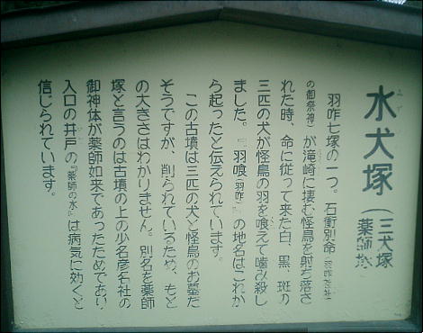 「旧記」に「石憧別命下降、弓矢ヲモテ黒白斑犬ヲ率キ連レ鳥ヲ射落ス三犬之ヲ殺ス (略) 又三犬共ニ死ス今水犬