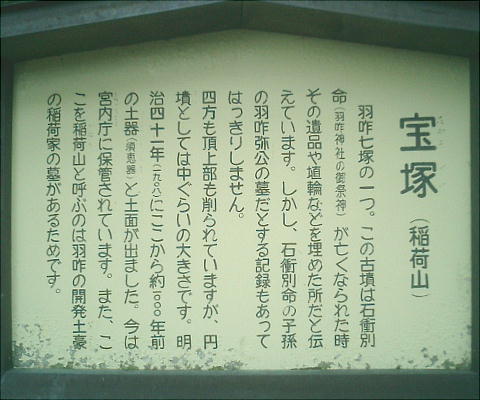 昭和4年5月羽咋神社社務所刊の「官弊中社昇格願書」には、「宝塚ハ今字稲荷山也、石憧別命甍去、殉死ノ為メ動