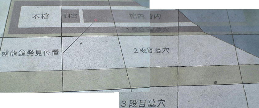 て、ここで1枚の銅鏡が見つかった。「景初四年銘斜縁盤龍鏡」。面径16.8cm、背面には、4頭の龍が描かれ周囲に35