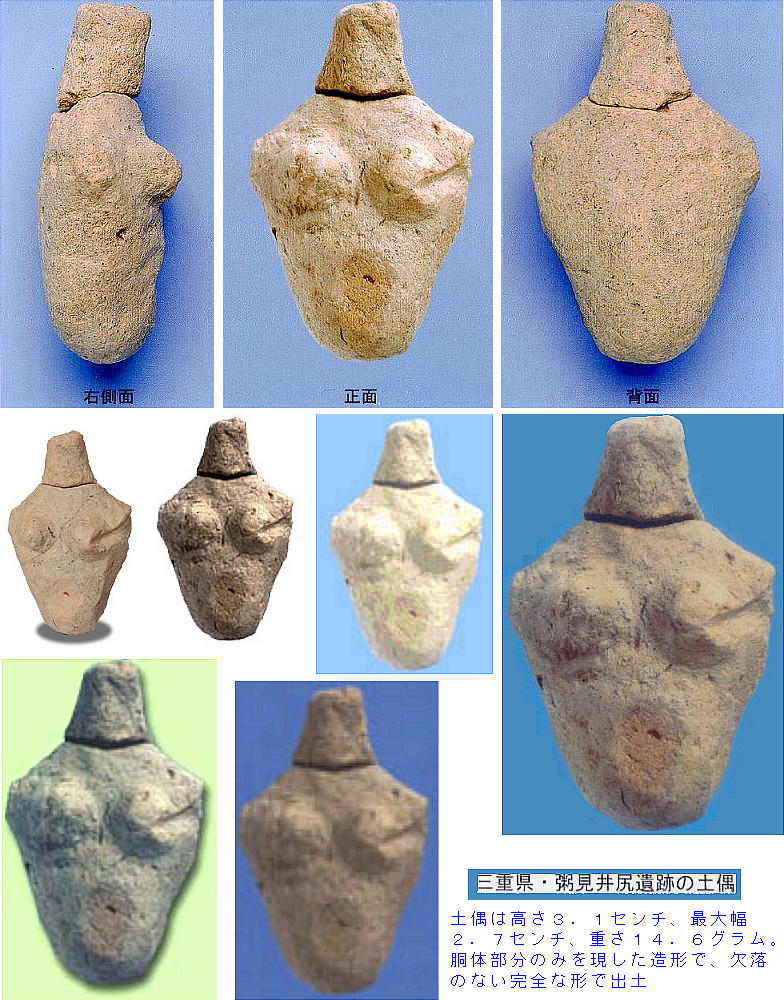 土した。三重県松阪市の粥見井尻(かゆみいじり)遺跡から出土した同時代の土偶(全長6.8センチ、最大幅4.2センチ)が