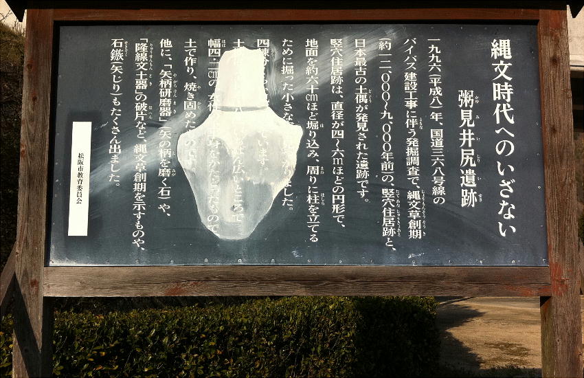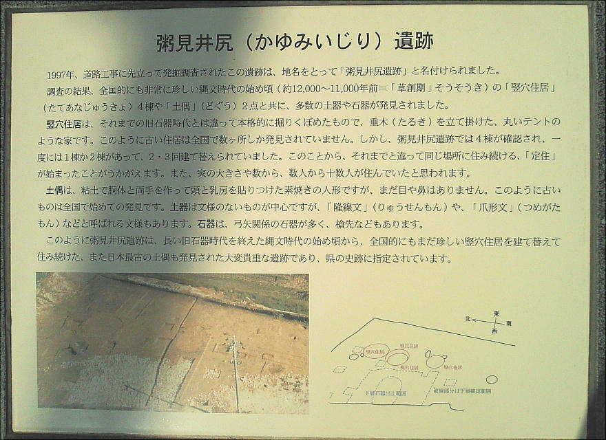 片など縄文時代草創期を特徴づける遺物が発掘されている。現在、この遺跡跡は「粥見井尻遺跡公園」として竪穴住居が2棟復元