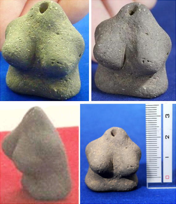 発見された土偶は高さ3.1センチ、最大幅2.7センチ、重さ14.6グラム。女性の胴体のみを、胸や腰のくびれも優美に