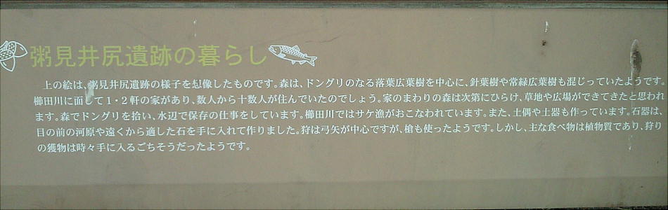 粥見井尻遺跡では全国的にも珍しい縄文時代の草創期(約12000〜11000年前)の竪穴住居跡が4棟見つかった。長い