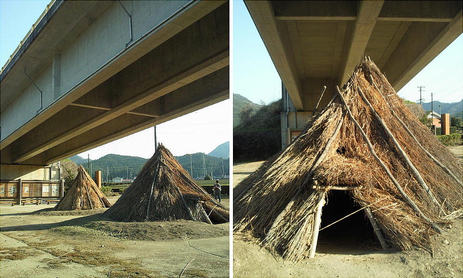 高架の下に、なにやら復元住居のようなものが見える。「あすこだ!」