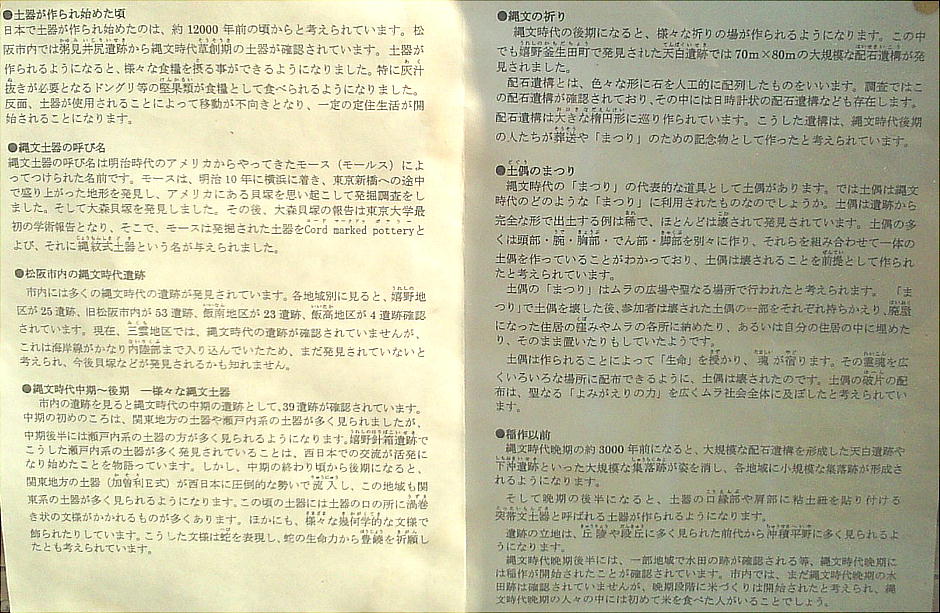 この櫛田川の近くで花開いた縄文人の生活がしのばれる。毎年10月にはこの場所で遺跡祭りが開催され、家族連れなどが参加