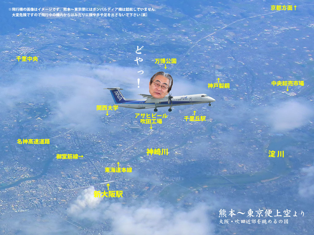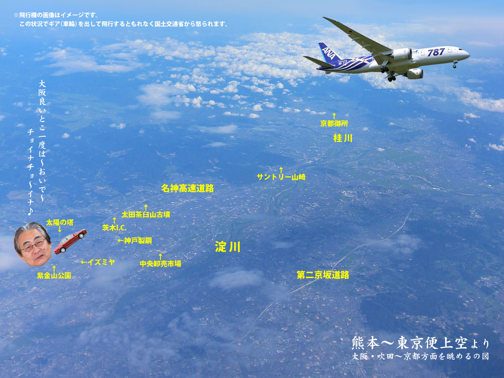 HPをuploadしてその連絡を林さんへしたら、早速以下の写真を送ってきた。東京へ行ったとき写した写真だそうで、大阪上空を飛んだ
