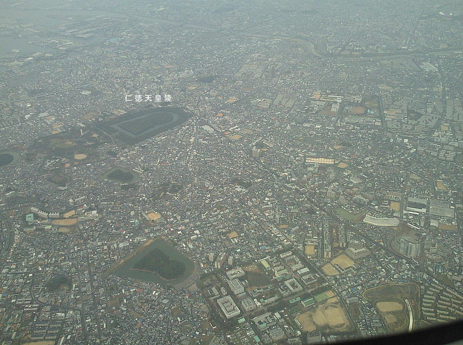 「堺市古墳群」の上を飛ぶ。このあたりまで来ればジェット機でも古墳の形は分かるが、やはりボンバルディアの方が大きく見える。