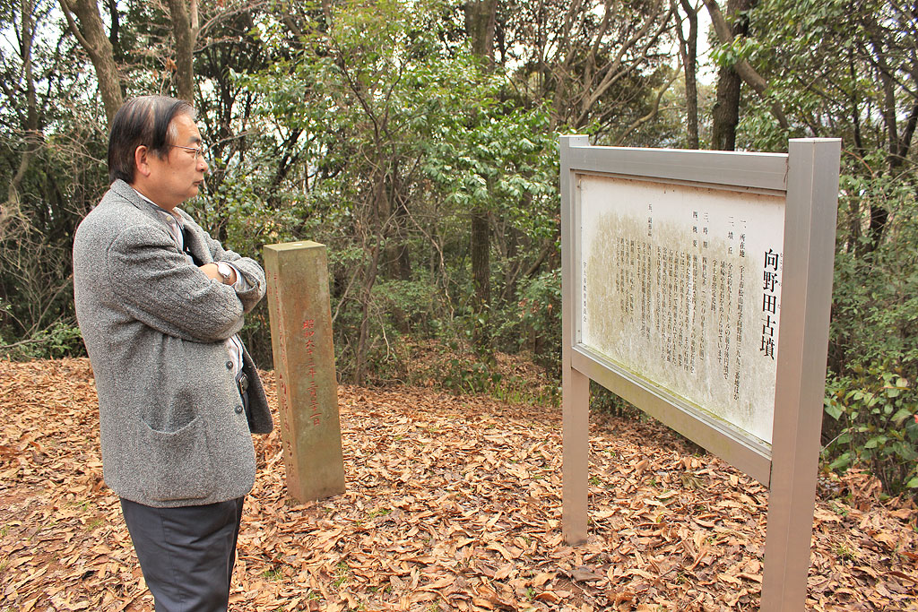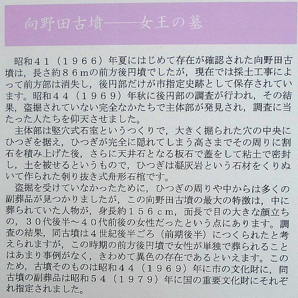 女王が祭られた墓という向野田古墳。前方後円墳だが前方部は既に失われ、後円部のみが残る。その後円部に竪穴式石室があり,その内部