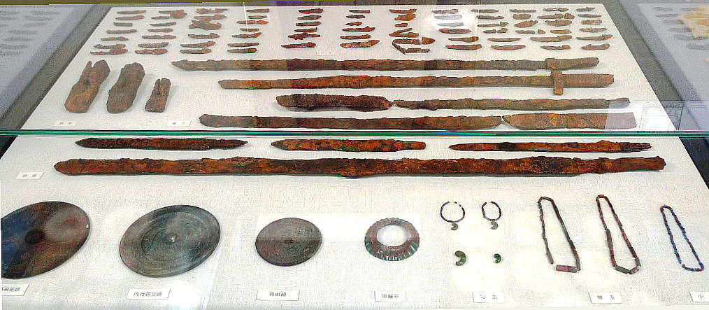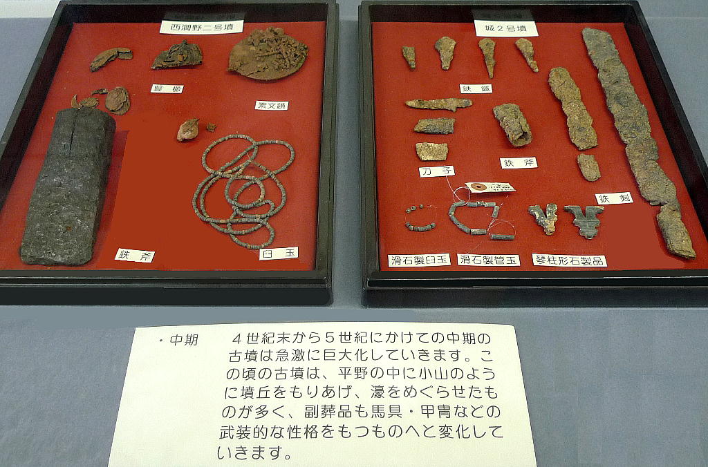 は鏡3面のほか,碧玉製車輪石という腕輪やヒスイ製の勾玉,ガラス小玉などが出土し,石棺外には鉄刀や鉄剣,ヤリ,鉄斧などの武器