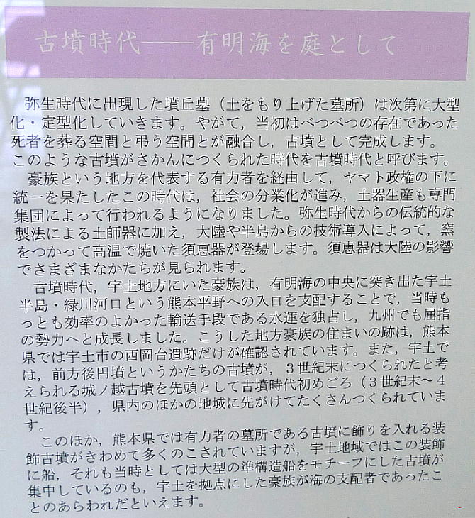 古墳は宇土半島の基部に位置する前方後円墳である。出土品は、良質な内行花文【ないこうかもん】鏡、方格規矩【ほうかくきく】鏡を