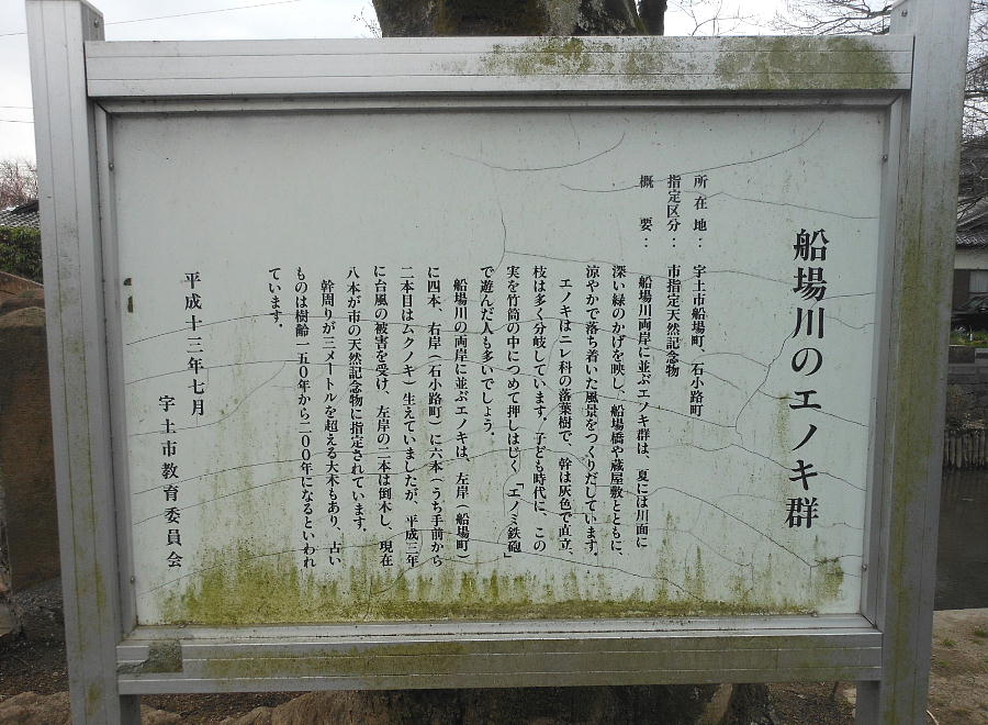 宇土市の市街地を流れる船場川両岸のエノキで、昭和53年(1978)10月9日に宇土市の天然記念物に指定された。当初指定