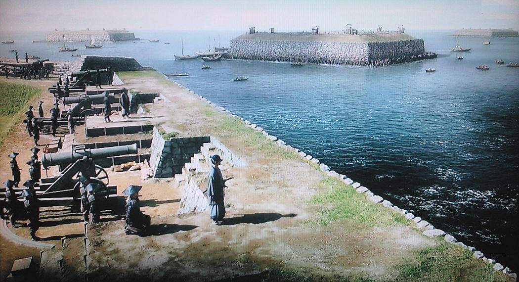 慌てて双眼鏡を覗いたペリーは、堅固そうな石垣で築かれ、大砲が自分の方に向いている、まぎれもない人工島が幾つも江戸湾の奥