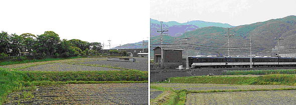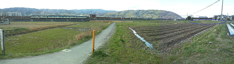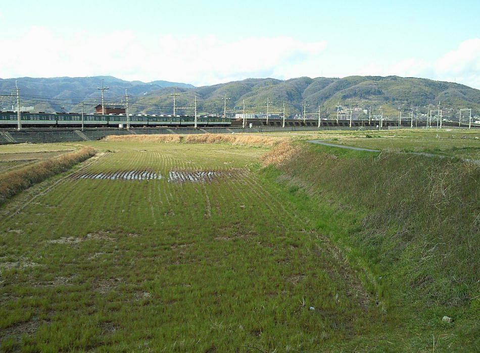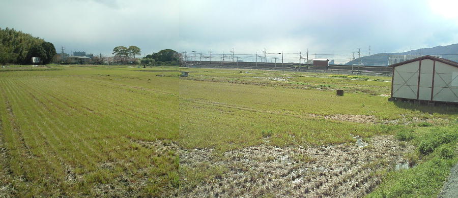 その南側の水田。ここが「くずはお台場跡」だ。高い堤防が淀川の堤防で、その手前の高架は京阪電車の線路である。
