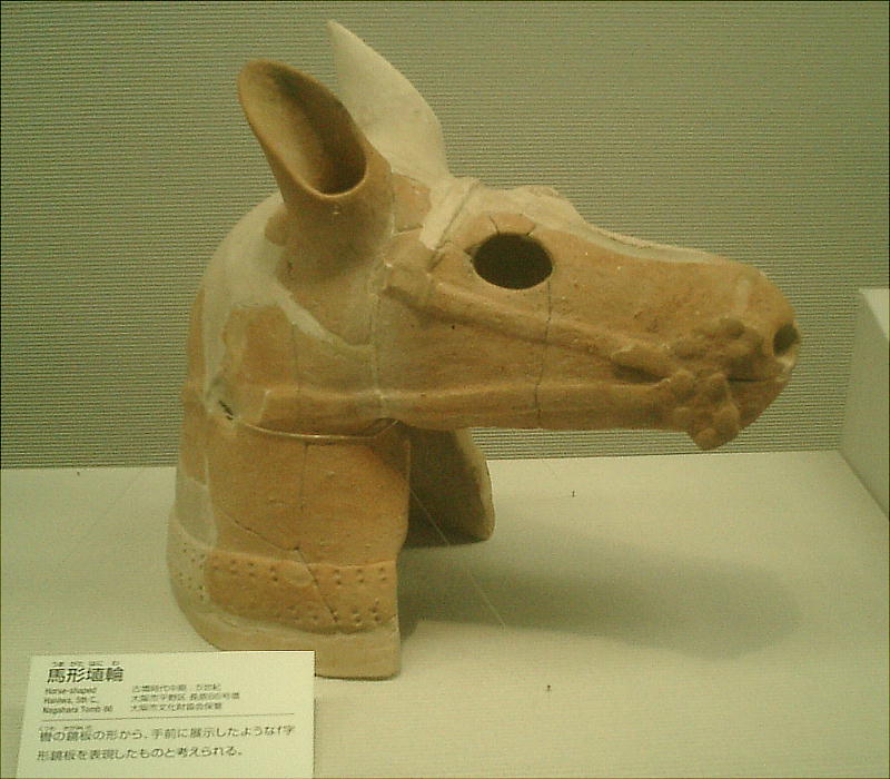 古墳時代中期(5世紀)の長原86号墳からは、轡の鏡板の形から馬の口のまわりにf字形鏡板を表現している馬形埴輪が出土し