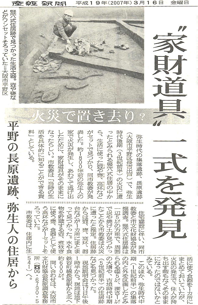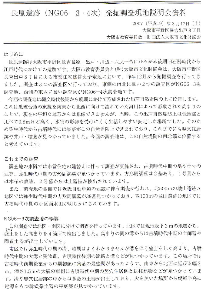 大阪市教育委員会と(財)大阪市文化財協会は、長吉長原東1丁目にある市営住宅建替え予定地において、発掘調査を行っている。
