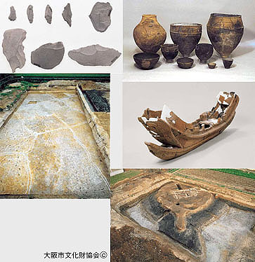 る長原古墳群も広がっている。遺跡の東西に集落が広がっており、この2大集落は5世紀前半〜中頃の東集落から、5世紀後