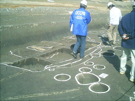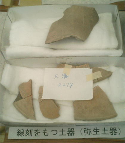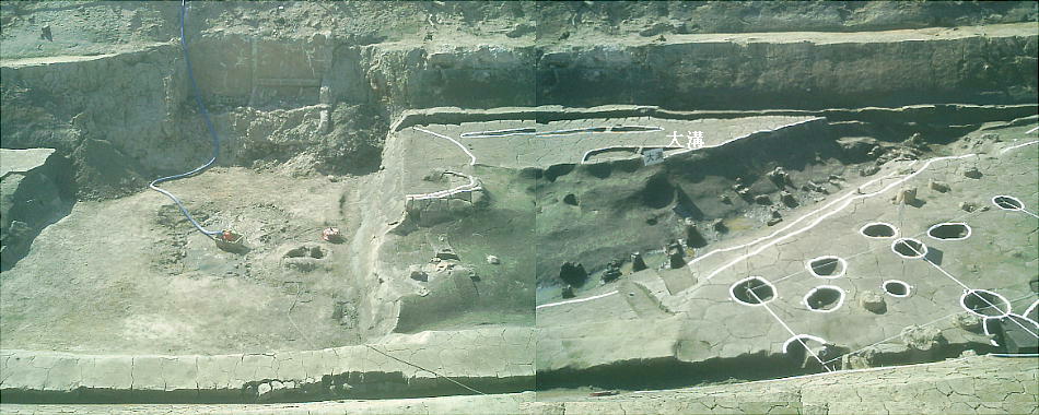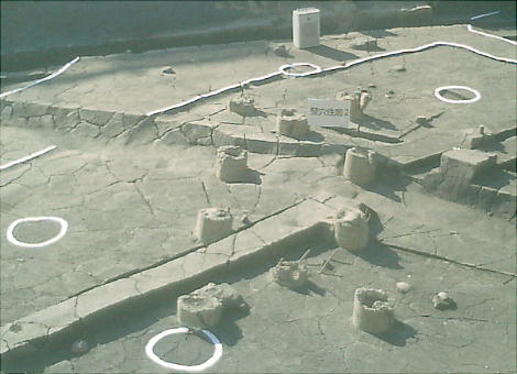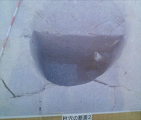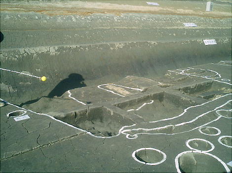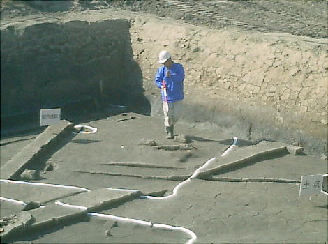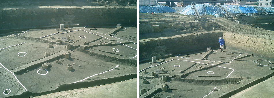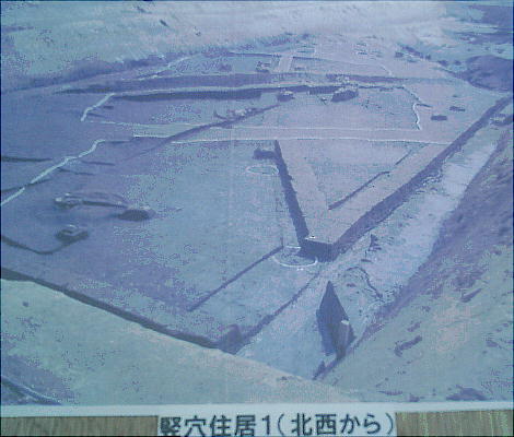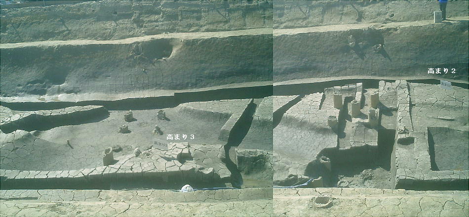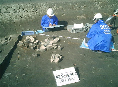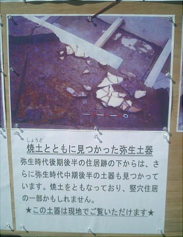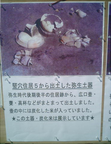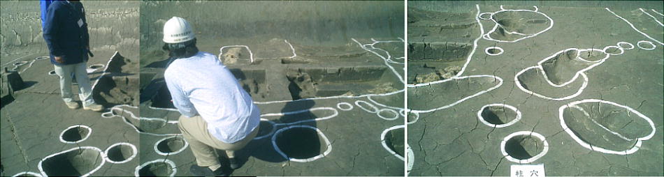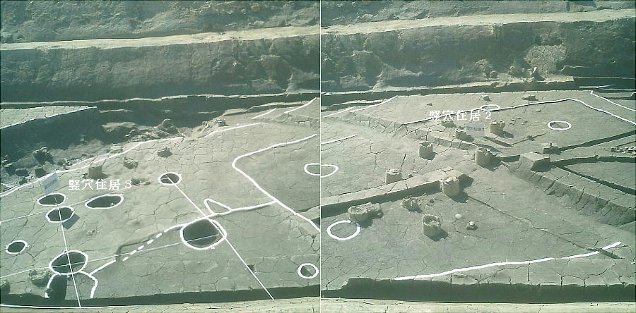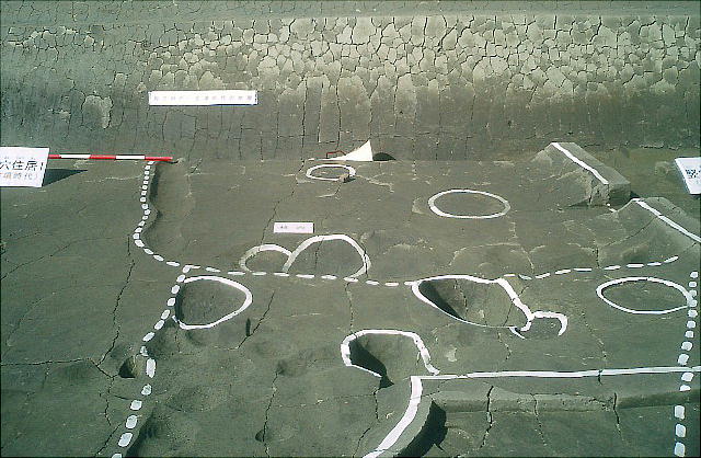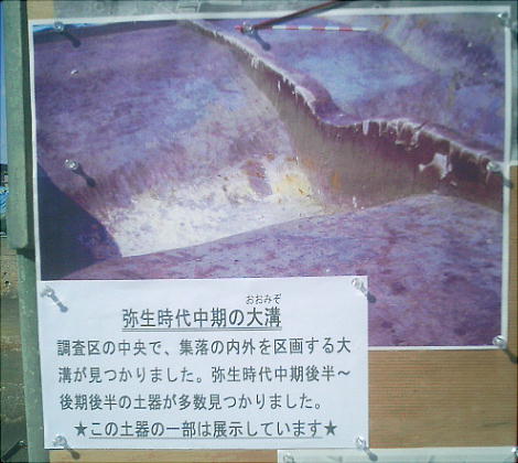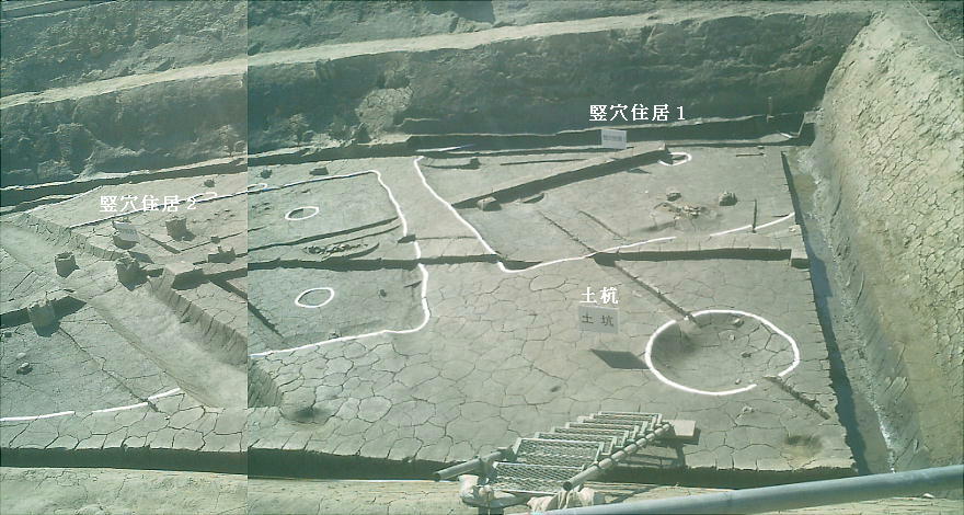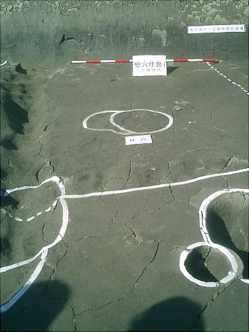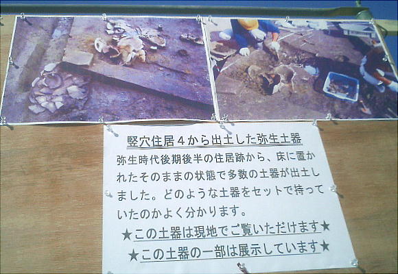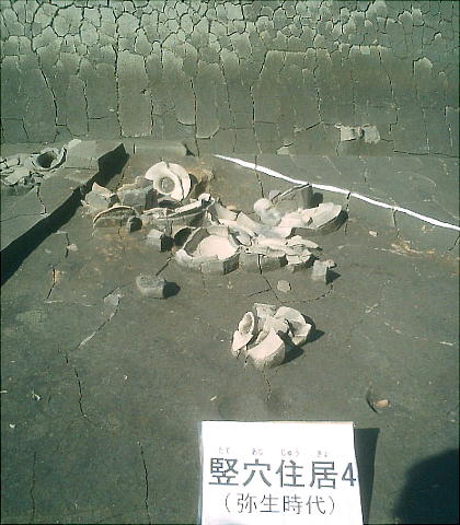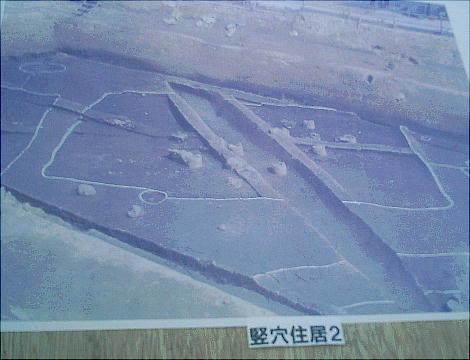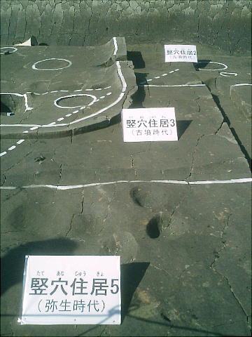 ここでは竪穴式住居3棟が見つかっている。住居の端に外界と集落を隔てるように大溝が掘ってあり、内からは土器片が出土した。