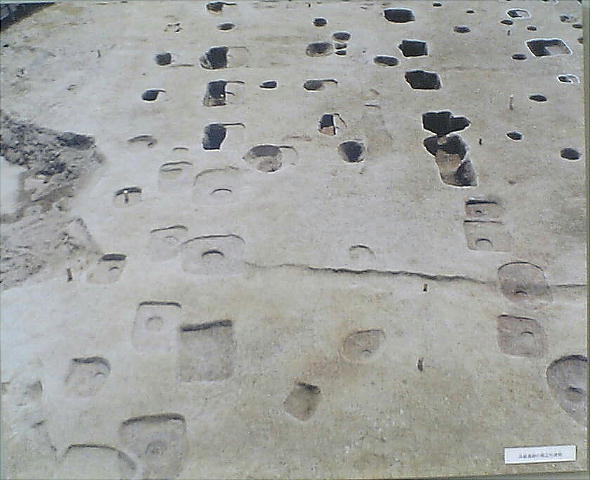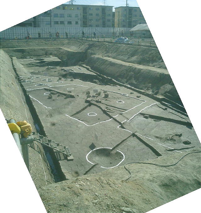 弥生時代前期〜中世に至る集落遺跡。大溝があり環濠集落の様子をみせ、竪穴住居・高床倉庫・井戸が現われ、方形周溝墓や木