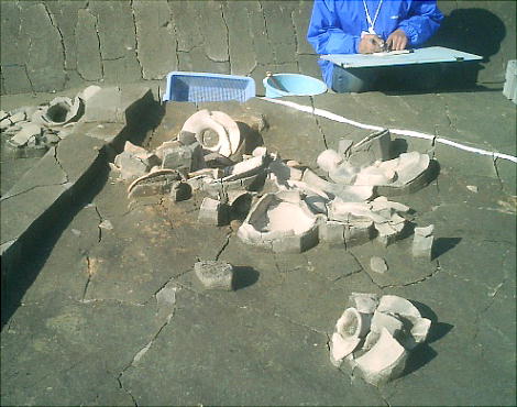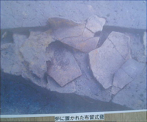今回の説明会は、発掘調査の作業風景も見て頂くと言うことで、説明するおじさんの横でバイトらしき若者が土器を取り出していた。