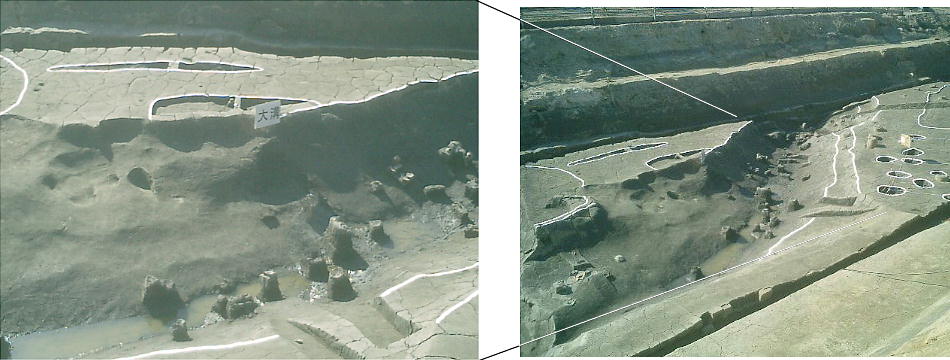 た。まず弥生時代中期には、竪穴住居2棟や、大溝が見つかっている。前回の調査では、西端の大溝から多量の土器が出土してい