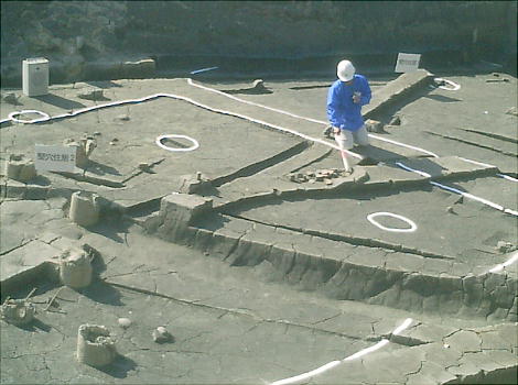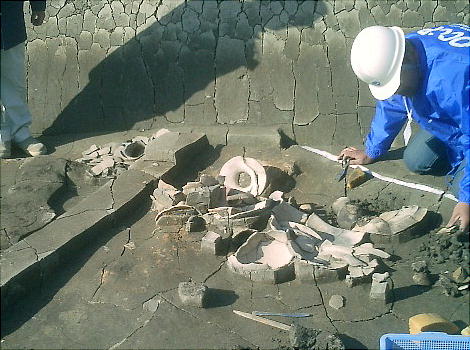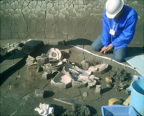 って焼けた土の上では、甑(こしき:蒸し器)や甕など、煮炊に使われた土器がつぶれて見つかっている。炭や焼土を捨てた土坑