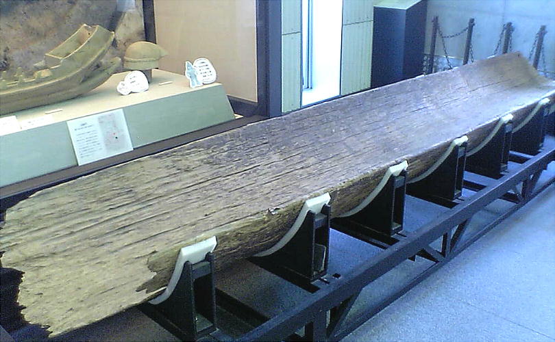 じめ)で発見された。手前は2号墳から出たのもので全長129cm、後ろは1号墳で全長100cm。いずれも袴抜きの舷側