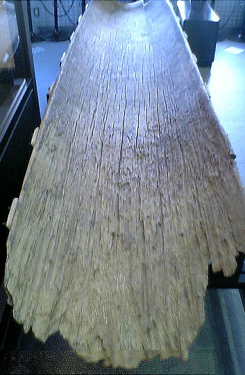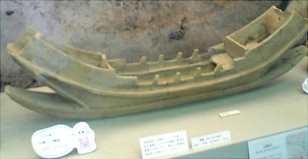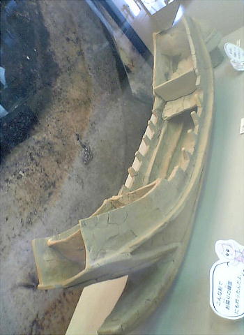 板を付けた準構造船で、手前のものは特有な形(前後がワニのように二股に分かれている)をしているが、南久宝寺遺跡で見つ