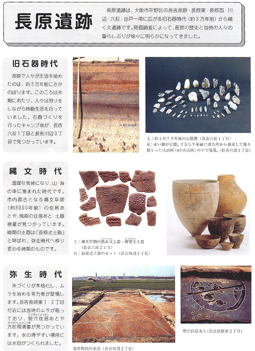 長原遺跡は、大阪市平野区長吉長原・出戸・川辺・六反一帯に広がる、後期旧石器時代から江戸時代にかけての複合遺跡である。