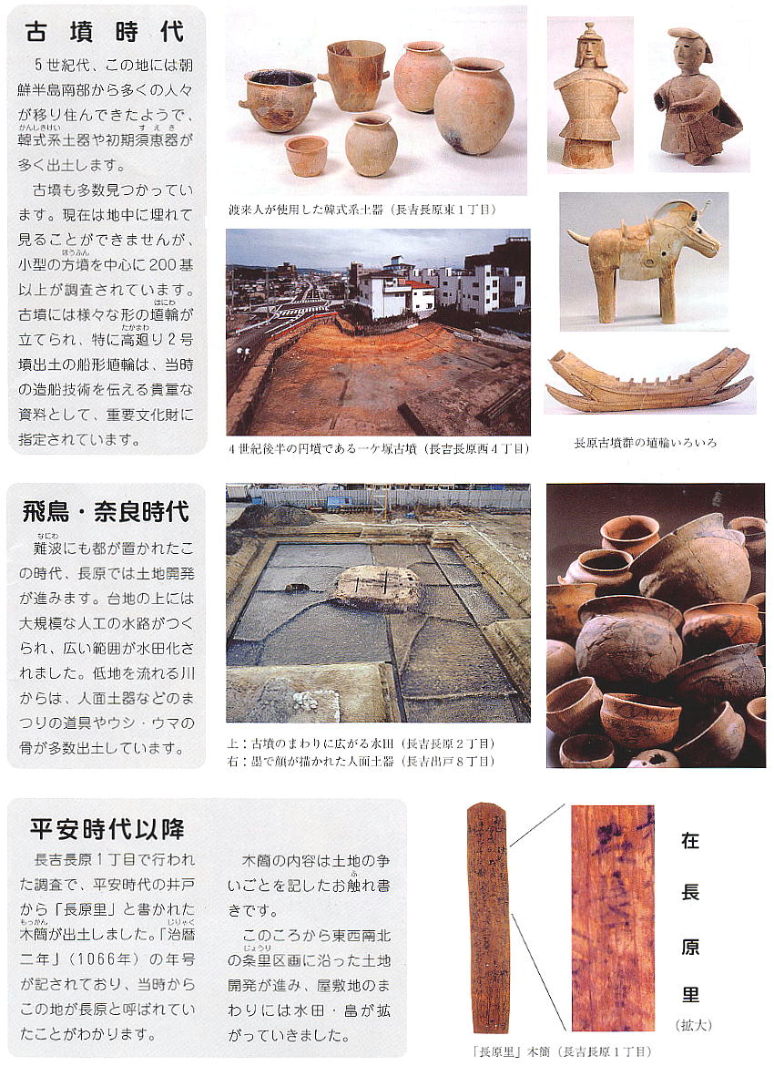 1973年、地下鉄谷町線延伸工事に伴う調査で長原遺跡が発見された。長吉長原東一、二丁目付近には弥生時代の村が眠って