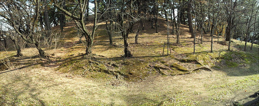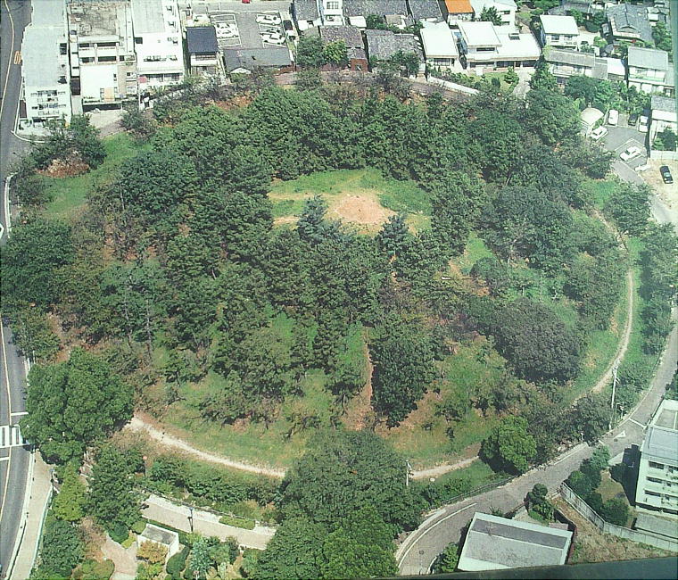 6年に国から史跡として指定された。直径82m、高さ10m、外周は幅10mの濠となっていて、当時は老松大木が鬱蒼と茂って