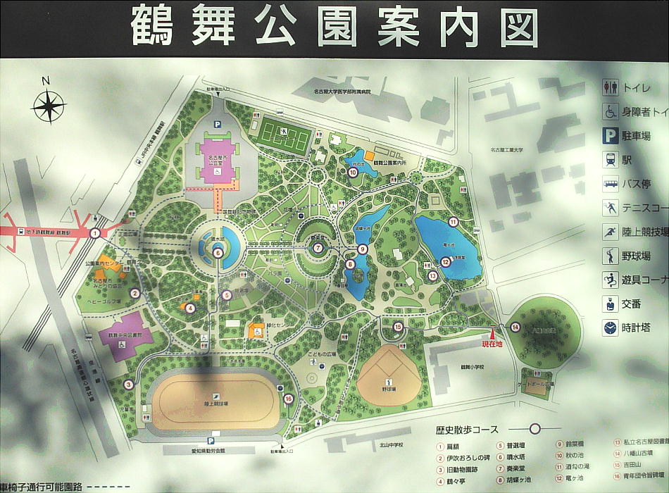 公園の西側は平らだが、公園の東側は緩やかな丘陵地帯になっている。公園の西中央付近にある鶴舞駅(JR鶴舞駅南口)から公園に入る