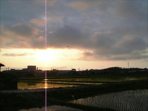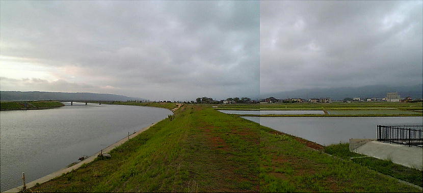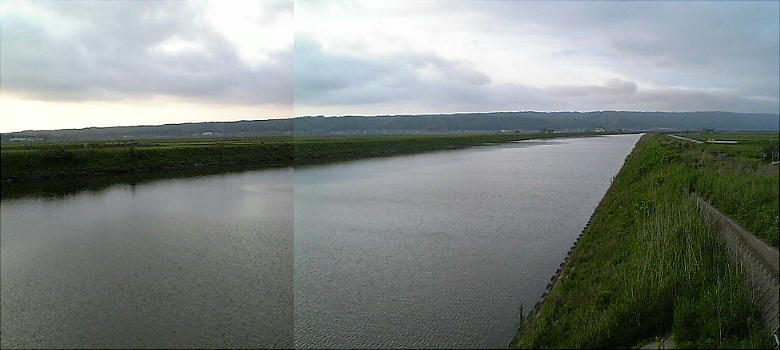 遺跡すぐ側の「釜屋大橋」からみた、暮れてゆく羽咋川の下流(上)。と、