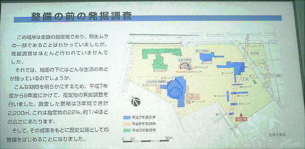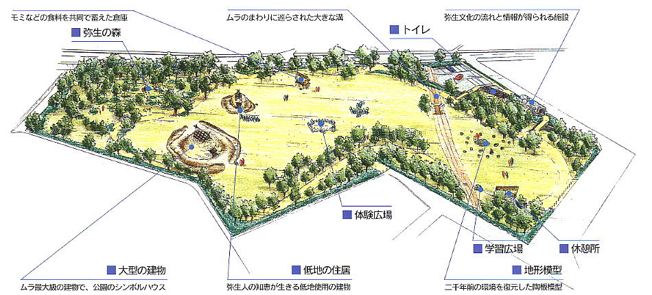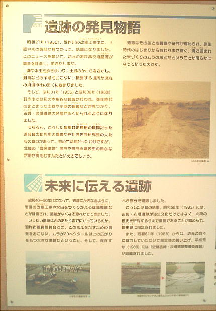 る。その後十数次にわたる調査の結果、弥生時代全般を通じての大規模な集落跡である事が確認され、一部は現在史跡公園