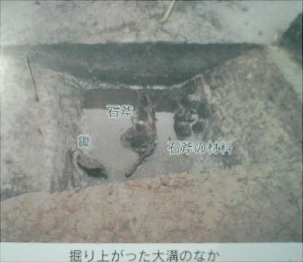 は石斧やアメリカ型を含む石鏃、環石、有樋式磨製石剣(断片)、未成品を含む玉類などがあった。とくに注目されるのは