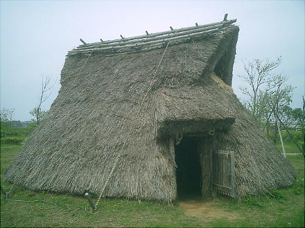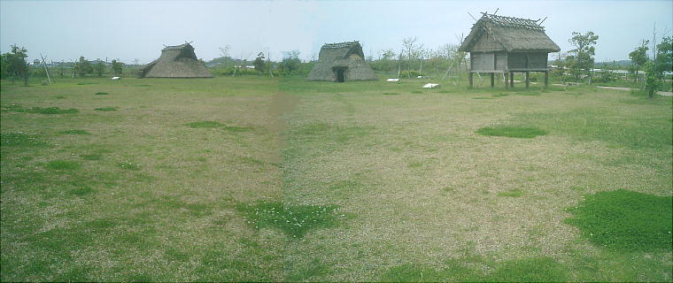 公園には、高床式建物、竪穴式住居、大型住居の3棟が復元されている。