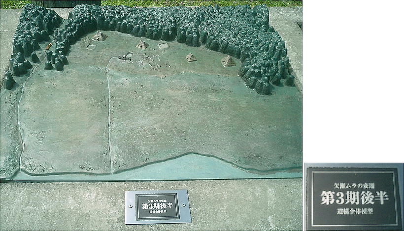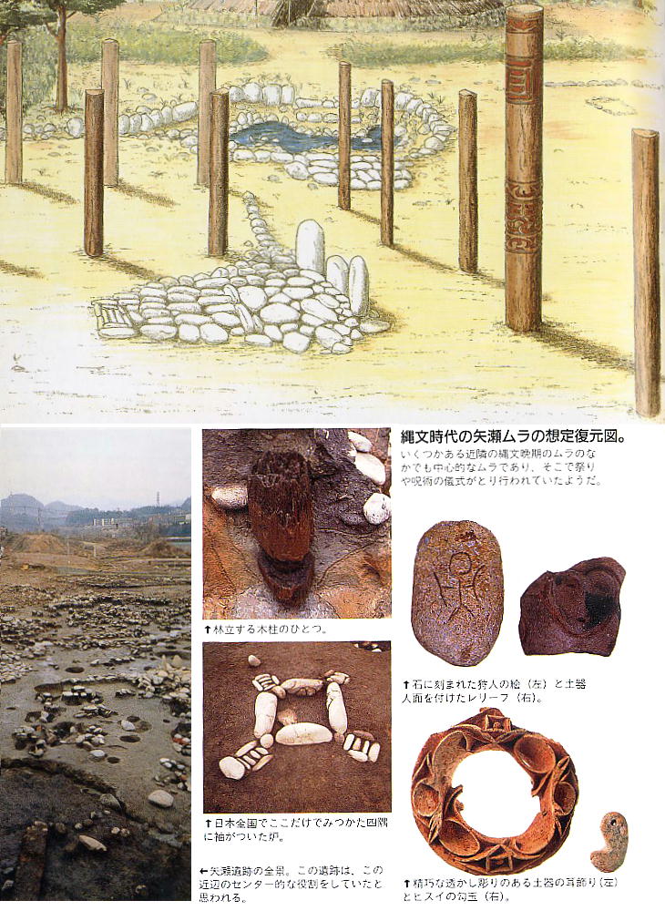 矢瀬ムラでは、他のムラではあまりみられない水場・祭壇・巨木柱・四隅袖付炉などと、縄文の一般的な遺構である住居・高床建物・
