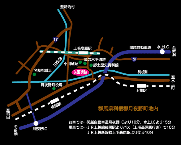 矢瀬遺跡が発掘された月夜野町は、群馬県北部の沼田市と水上町の間にあり古くから関東と北陸を結ぶ重要な交通ルートの要衝として