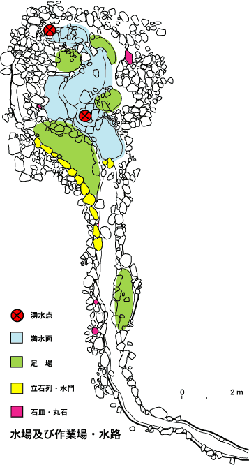 さらにその周囲を石組みで固めている。この水場は聖水や浄水を汲むのに利用されていたらしいが、その横には石皿等を配置した作業
