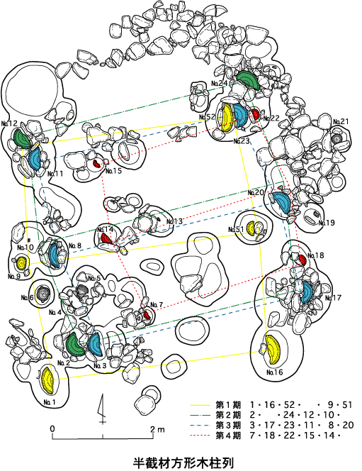 さいざい)が半数以上で、四角形に配列されて立てられた部分(方形木柱列)も見られる。丸材の方形の木柱列は径50センチ級の巨