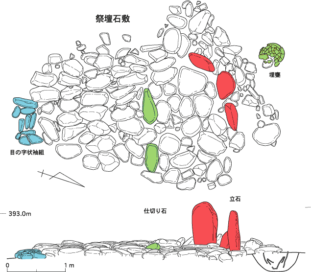 3mの大きさで、立石や、扁平な石を横方向に立てて並べ、目の字状配石と特殊な構造であり、埋甕も伴う。この祭壇や水場と配