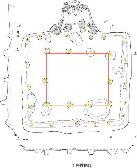 竪穴住居は22棟が見つかり、炉のない10本柱の大型住居を中央に、多様な竪穴住居が南北に分かれて分布する。石囲炉をもつ